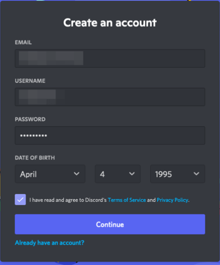 the title “create an account” at the top and a few questions